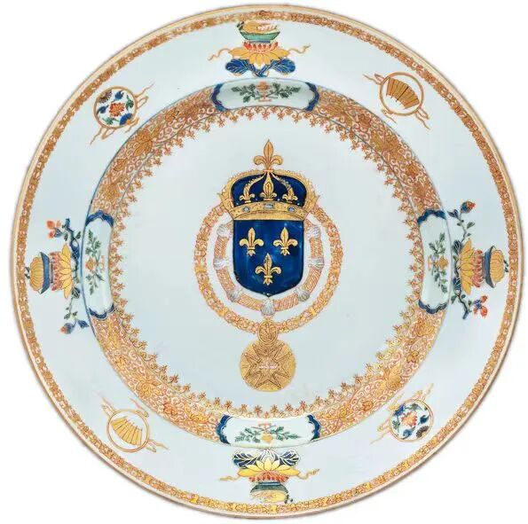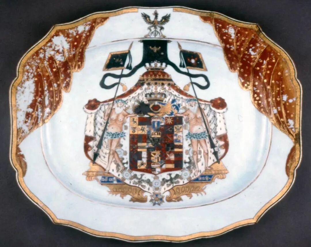 如果说“克拉克”时尚主打蓝白色调的美感,纹章瓷的时尚格调则反映在私人定制上。16世纪初,随着中国瓷器在欧洲大量出现,拥有一般的瓷器已无法凸显贵族身份。欧洲贵族想到了一个“绝绝子”的办法——私人定制。具有皇室纹章、贵族纹章、团体纹章等特定图案的纹章瓷应运而生,它既是中外合璧的“混血儿”,又是引领时尚的“宠儿”。![]()