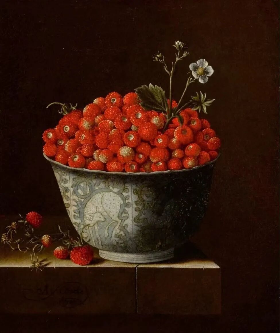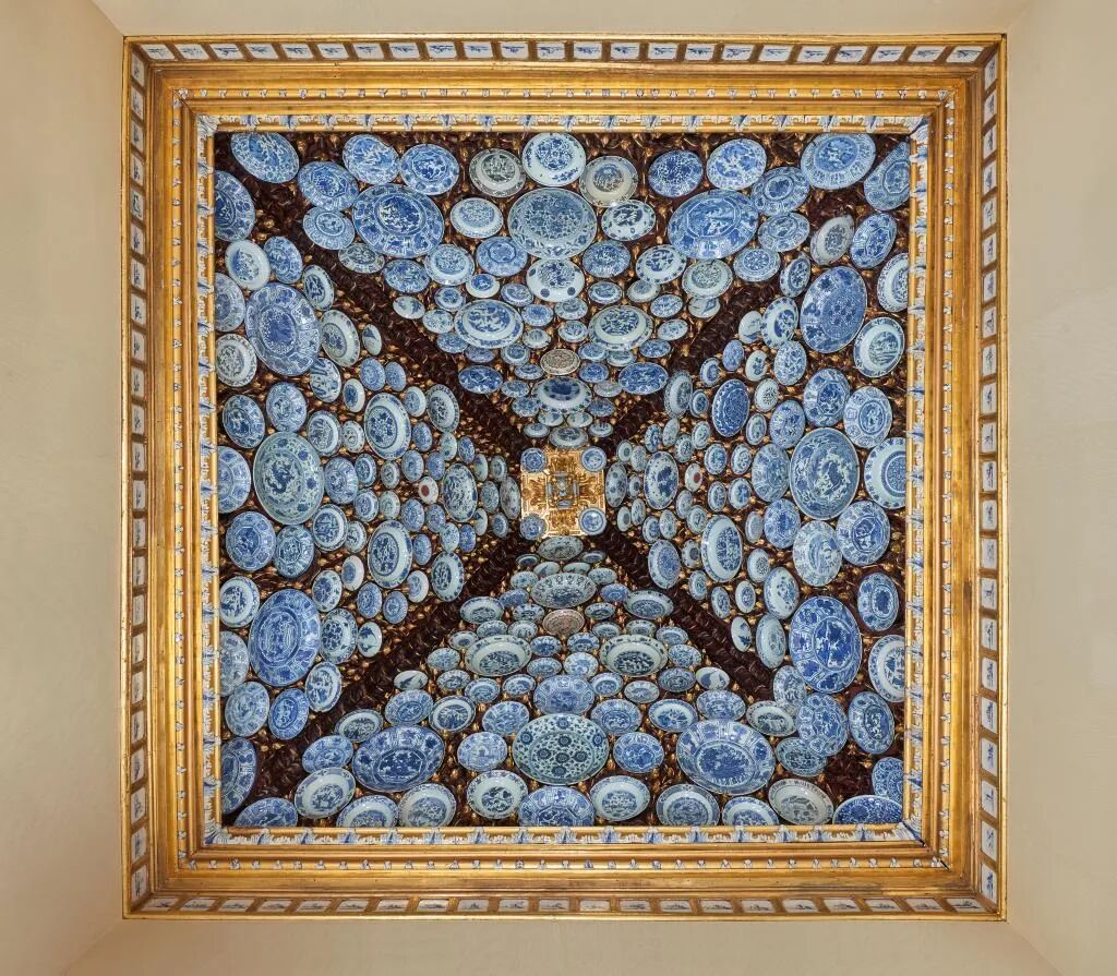▲荷兰17世纪静物画家阿德里安·库尔特作品《野草莓》,采用克拉克青花大碗作为创作元素。17世纪上半叶,约300万件中国瓷器被荷兰人贩运至欧洲,这些瓷器大部分是克拉克瓷。整个17世纪,约1600万件中国瓷器远涉西洋。克拉克瓷不只作为实用器具出现在欧洲贵族人士的茶话会上,还用作房间装饰。葡萄牙里斯本桑托斯宫,原本是葡萄牙国王曼努埃尔一世的寝宫,1629年贵族兰卡斯特家族将这一宫殿买下,家族成员若泽·路易斯·德·兰卡斯特便将自己收藏的两百余件克拉克瓷盘镶嵌在天花板上,将欧洲贵族阶层追捧中国瓷器的风尚推到极致。