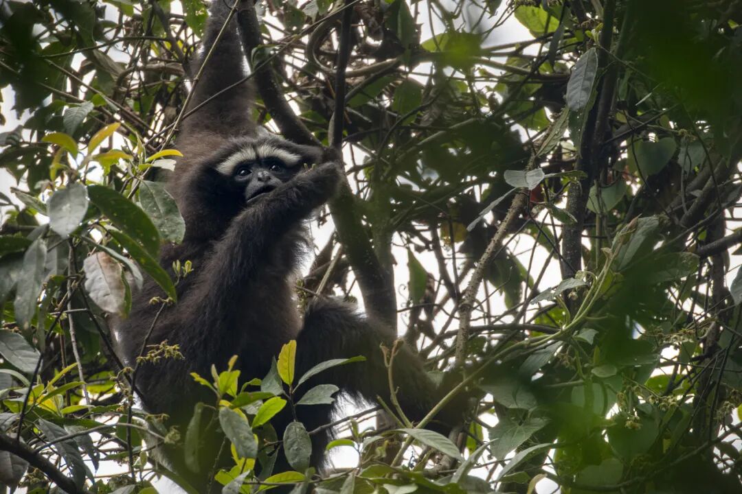 ▲白眉长臂猿,也称天行长臂猿,数量仅存不到200只,低于国宝大熊猫,极为濒危。在我国仅分布于怒江以西的高黎贡山南段保山隆阳区、腾冲市和德宏州盈江县。(图片来源:视觉中国)