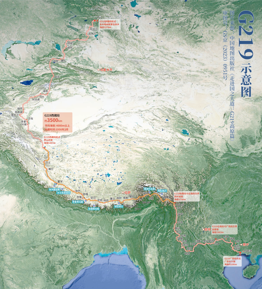 经历多次改造和扩建,如今,219国道北端延伸至新疆喀纳斯,南端延伸至广西东兴市,串起新疆、西藏、云南、广西4个边境省(区),全长10065公里,是中国首条长度超过1万公里的公路,也是中国目前里程最长的国道,还是世界上平均海拔最高的公路。