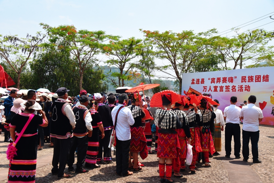 ▲“宾弄赛嗨”是傣语,指各族群众在日常生活中结交到的“没有血缘关系但胜似亲戚的朋友”。图为2024年4月29日,云南孟连“宾弄赛嗨”民族团结万人宣言签名活动现场。樊二东摄(图片来源:新华网)