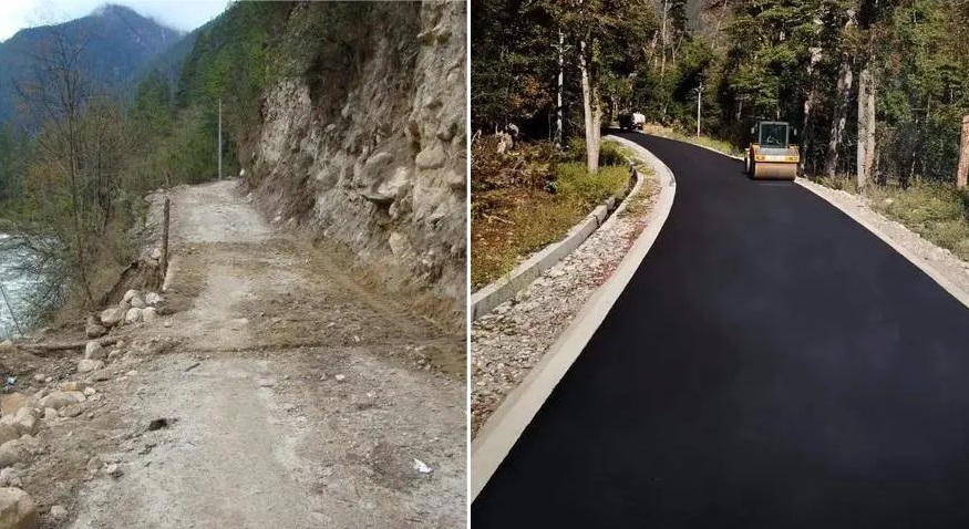 ▲察隅县位于西藏林芝市东南。2019年2月,曾是深度贫困县的察隅县历时五年,天堑变通途,终于脱贫摘帽。图为察隅本布公路修建前后。(图片来源:《中国乡村振兴》杂志社官方账号)
