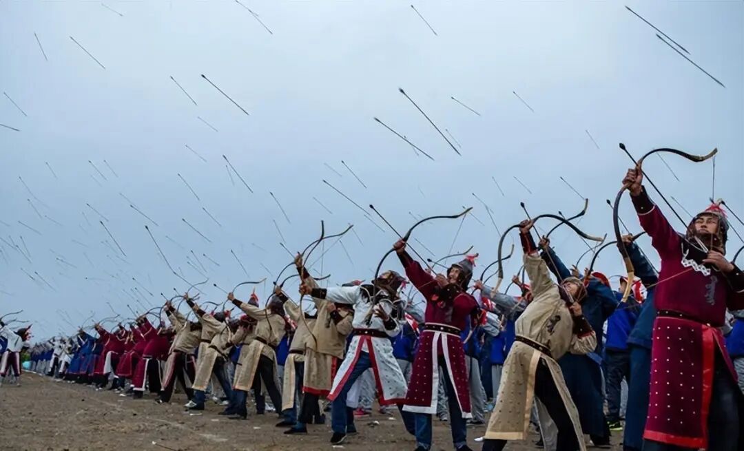 锡伯族的锡、汉双语教育也独具特色。锡伯语属阿尔泰语系满—通古斯语族满语支,1947年,宁西县(今察布查尔锡伯自治县)改革委员会在满语基础上稍加变化形成了现在的锡伯语。历史上,新疆锡伯族在西迁后便开始施行锡、汉双语教学,这不仅是锡伯族教育的重要特点之一,也是提高民族文化素质的主要因素之一。如今,新疆锡伯族已基本实现了“民汉兼通”,不少人还兼通维吾尔语、哈萨克语等语言,被称为“翻译民族”,为促进民族间交流、增进民族团结发挥了重要作用。▲西迁节上,千人射响箭忆西迁。(图片来源:作者供图)