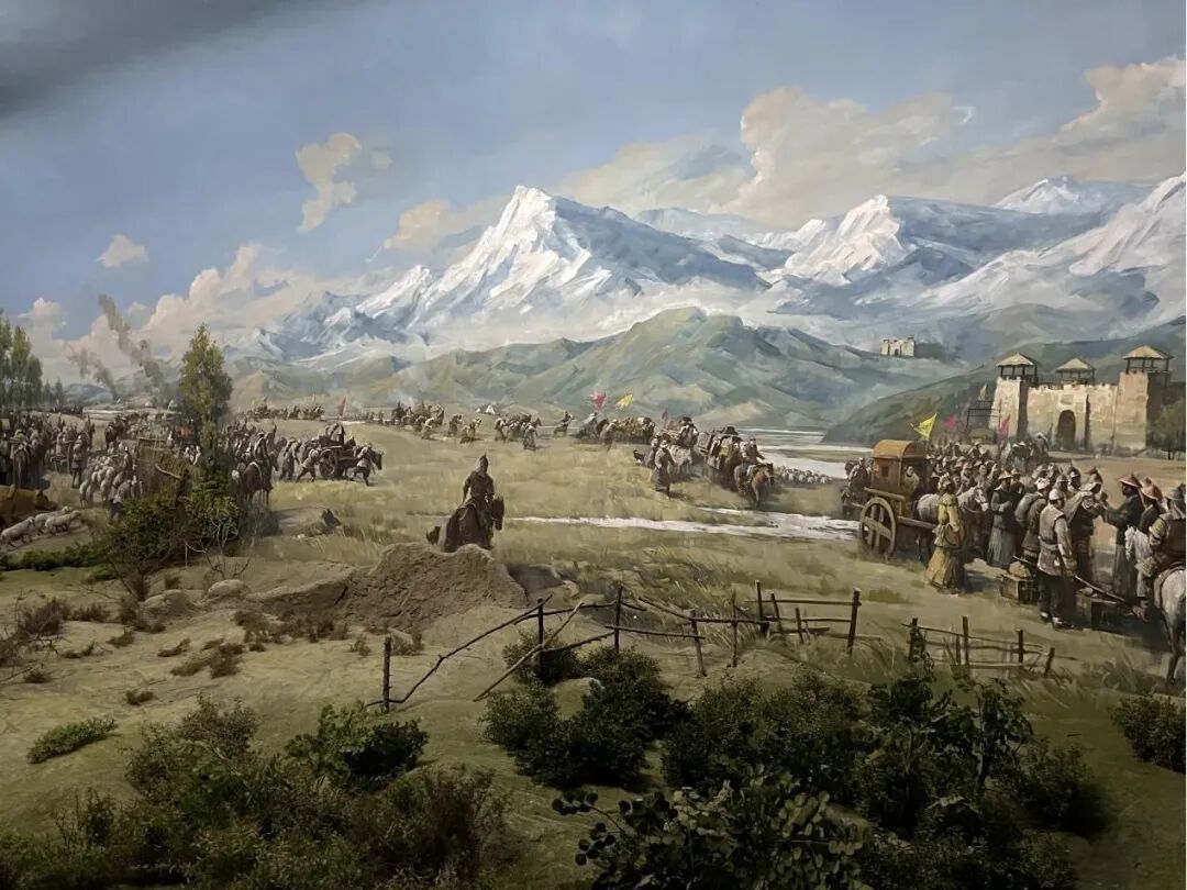 离别了故土,告别了家乡父老。锡伯族军民扶老携幼,赶着牛车、驼队,拉着行装向前行。一路上,他们冒酷暑,顶严寒,越千山,涉万水,风餐露宿,日夜兼程。除恶劣的自然天气外,长途跋涉还面临粮食断绝,靠挖野菜充饥的困境。至今,锡伯族每年春季仍要采摘一种名叫“乌珠穆尔”的野菜食用,以纪念西迁路途的艰辛。历经一年多的长途跋涉,克服重重难关,西迁队伍于乾隆三十年七月到达伊犁绥定一带(今霍城县)。据史载,在进入绥定城之前,风尘仆仆、衣衫褴褛的锡伯族军民,都穿戴上自己最好的衣帽,配带武器,精神抖擞地接受了伊犁将军的检阅。令伊犁将军感到惊奇的是,乾隆皇帝原本给了三年的期限,而锡伯族军队只用了一年零三个月就到达了新疆伊犁。除了登记在册的官兵及家属,算上途中出生的婴儿和自愿随军前来的人,实际到达伊犁为5050人。![]()