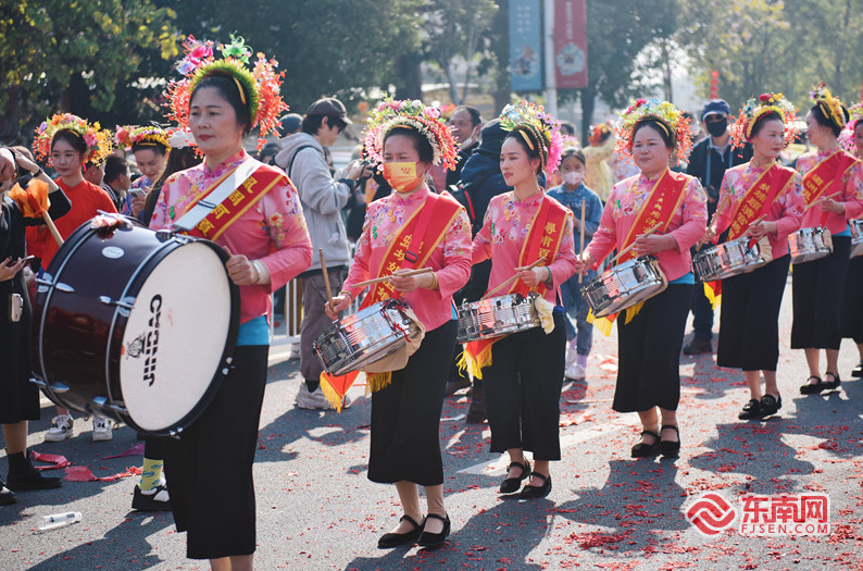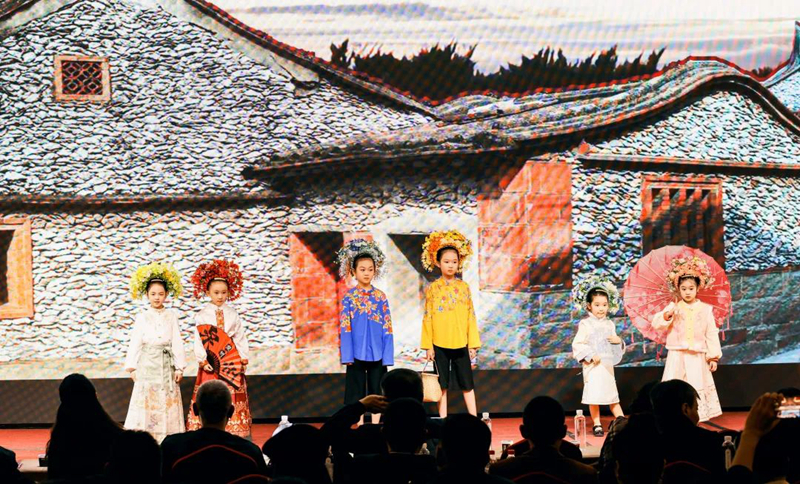 ▲头戴簪花、身穿民族服饰的“小蟳埔女”在发布会上登台亮相 。(图片来源:东南网)