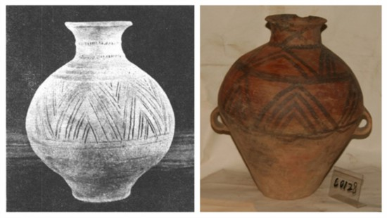 ▲左图为卡若遗址出土的陶罐(图片来源:翻拍自《昌都卡若》考古发掘报告);右图为甘肃马家窑文化三角折线纹彩陶壶(图片来源:马家窑文化官网)