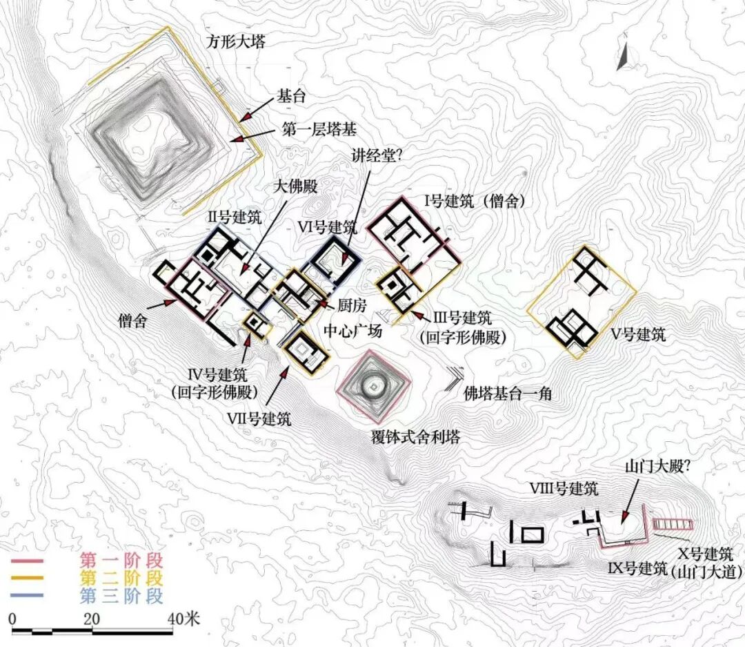 寺院建筑布局也被完整揭露,结合不同建筑朝向变化和打破、借用、避让关系,以及出土遗物特征和碳十四测年,揭示出寺院的演变规律和阶段性特征:至迟始建于公元3世纪中叶(东汉末或三国),约9世纪末10世纪初(唐代)废弃,延续时间近700年。