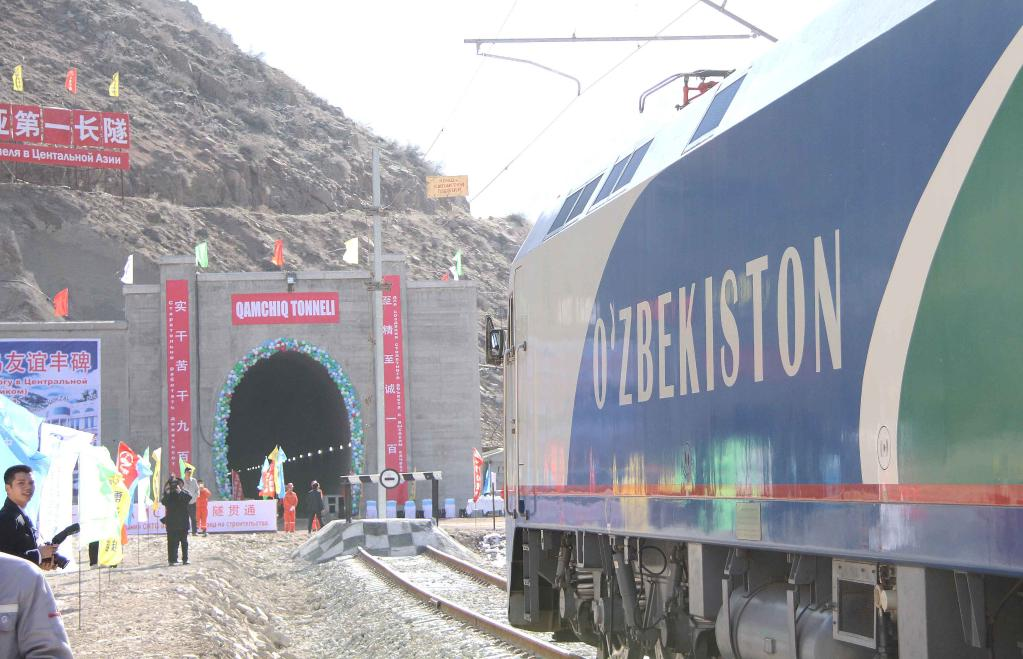 ▲2016年2月27日,一列专列停在乌兹别克斯坦安格连至琶布铁路甘姆奇克隧道进口。甘姆奇克隧道是“丝绸之路”经济带铁路网中吉乌铁路的重要一环。新华社记者 沙达提摄
