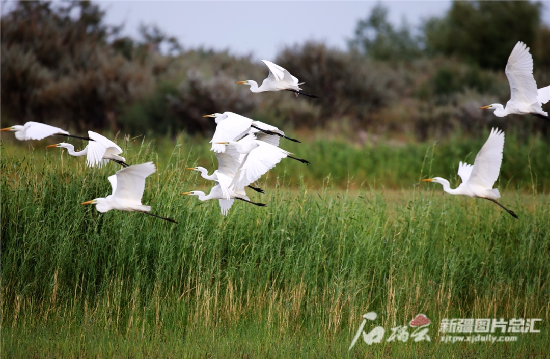 ▲成群的白鹭在阿勒泰科克苏湿地国家级自然保护区飞翔。新疆石榴云 阿尔达克·拜斯汗摄