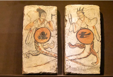 ▲甘肃省高台县骆驼城苦水口1号墓出土的伏羲画像砖、女娲画像砖。(图片来源:视觉中国)