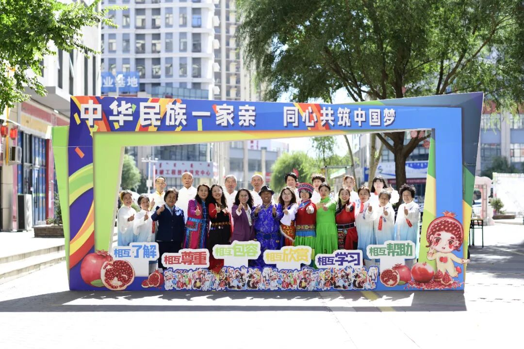 ▲2019年12月,鄂尔多斯市被国家民委命名为“全国民族团结进步示范市”。图为2022年9月,鄂尔多斯市各族居民在康巴什区康新街道悦和社区开展“中华民族团结一家亲 同心共筑中国梦”主题宣传活动。(图片来源:学习强国 王正)